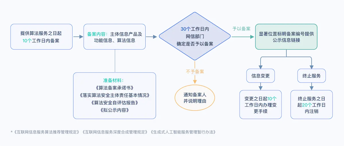 (2)大模型备案:主要适用于提供生成式人工智能服务的主体,此类服务通常基于深度学习或机器学习模型,通过对大量数据的学习和训练,生成文本、图像、音频等内容。例如,常见的语言生成模型、图像生成模型等。